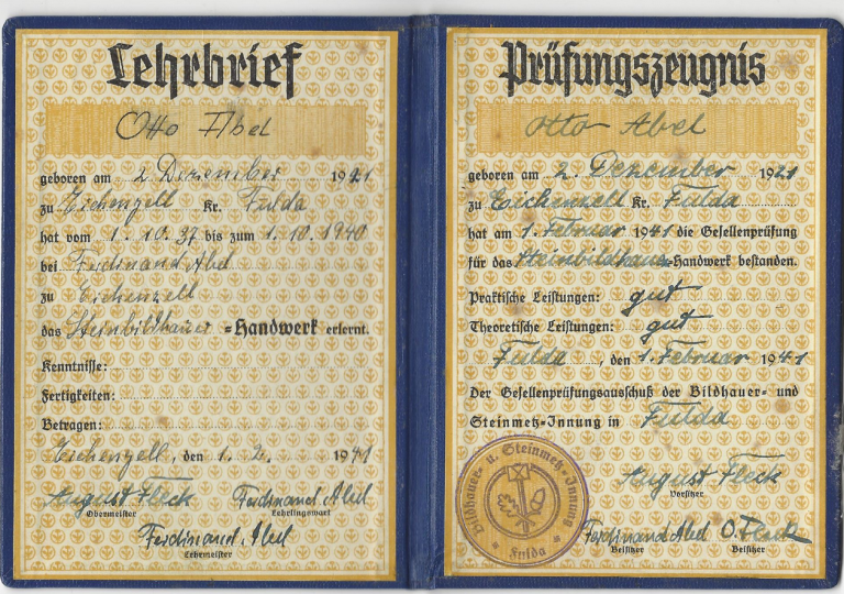 Sohn Otto Abel hat die Gesellenprüfung für das Steinbildhauerhandwerk bestanden