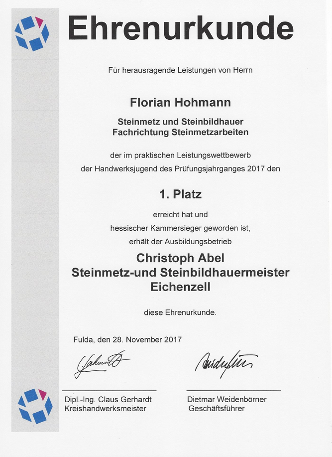 Herr Florian Hohmann hat den 1. Platz des Prüfungsjahrgangs 2017 des Steinmetz- und Steinbildhauerhandwerks erreicht